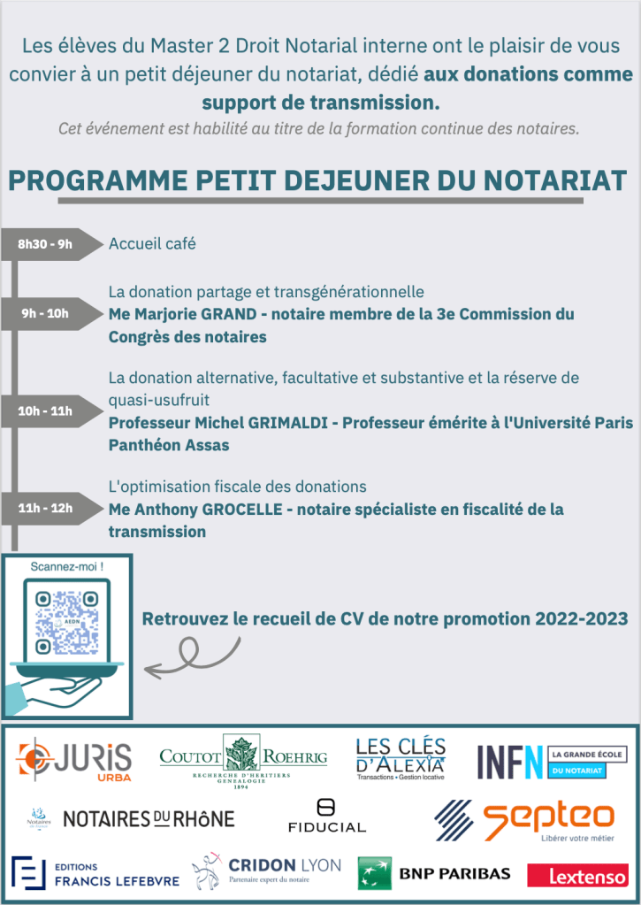 L’AEDN organise son premier petit déjeuner du notariat le 25 janvier 2023, sur le thème des donations comme support de transmission.